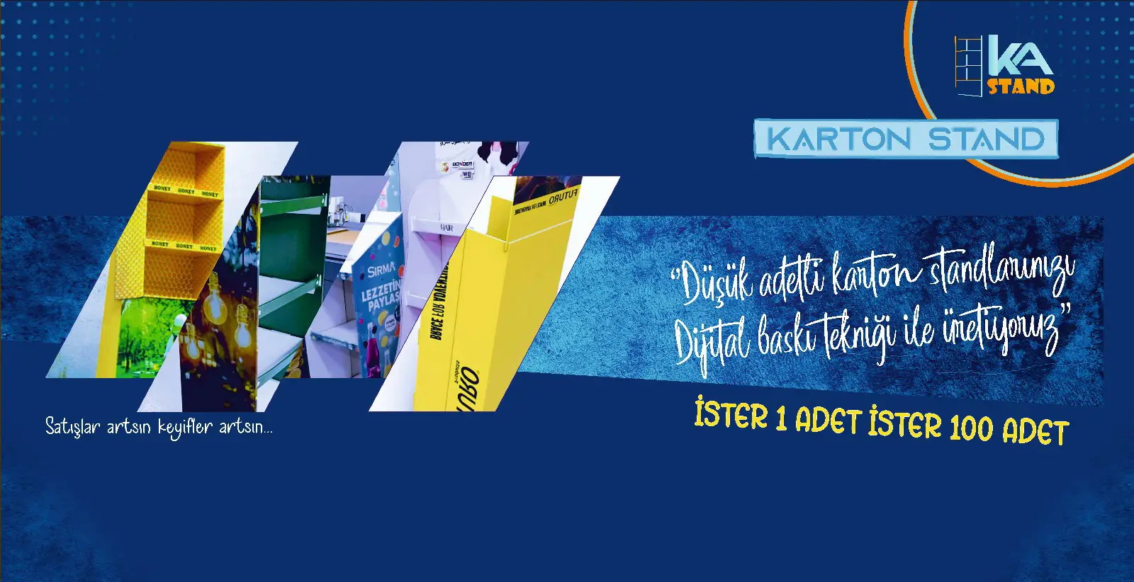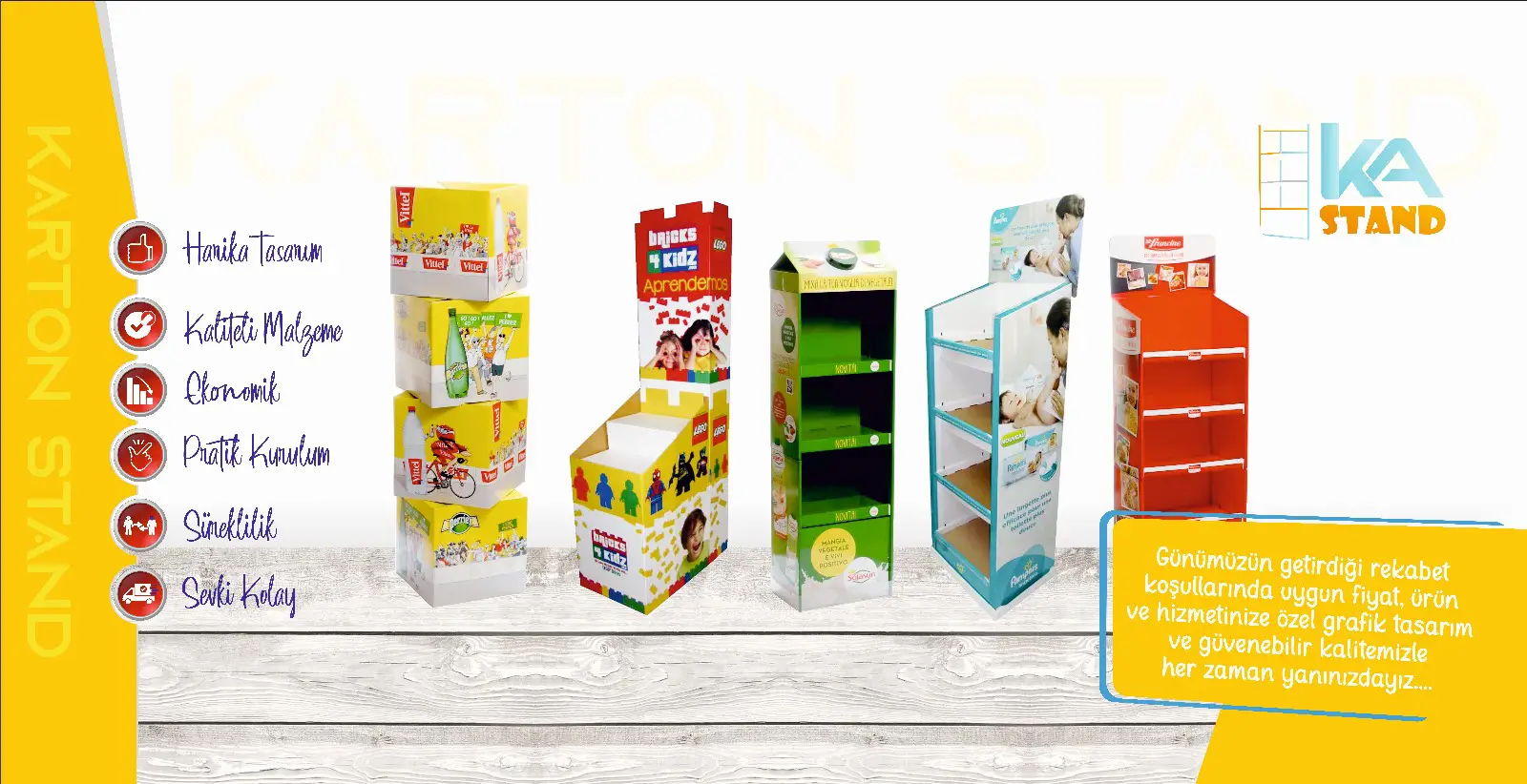 Müşterilerimizin ihtiyaçlarına yönelik ürün, hizmet ve kartondan standlar sunan, satışları arttıran ve modellerini sürekli geliştiren KA Stand girişimci, yenilikçi ve sorumluluk taşıyan vizyoner anlayışıyla Ambalaj sektöründe başladığı faaliyetlerine ; kısa sürede Display Kutu, Ürün Ambalajı, Özel tasarımlı ürünleri üretim alanlarını da ekleyerek Karton stand üreticisi haline gelmiştir.